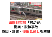 ニュース 田園都市線「梶が谷」衝突・脱線事故――原因・影響・復旧見通しを解説 まずは“いまわかっていること”まとめ 発生時刻:10月5日(日)23時ごろ。神奈川県川崎市の梶が谷駅付近で、各駅停車(渋谷方面行き・乗客149人)が留置中の回送列車に衝突し、回送列車の一部が脱線しました。けが人はいませんでした。... 2025.10.06 ニュース