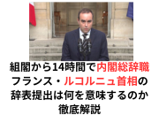 ニュース 組閣から14時間で内閣総辞職――フランス・ルコルニュ首相の辞表提出は何を意味するのか フランスのセバスチャン・ルコルニュ首相が、閣僚名簿の発表からわずか約14時間で辞表を提出し、内閣は総辞職となりました。エマニュエル・マクロン大統領は辞表を受理。近代フランスで最短級の政権崩壊で、国内政治は一段と不安定化しています。背景には、... 2025.10.06 ニュース