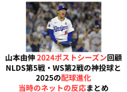 2024年の山本の10月は、NLDS第5戦の0封とWS第2戦の1安打快投が“二本柱”。前者で修正力と胆力を、後者で大舞台適性とゲームメイク能力を証明しました。フリーマンを筆頭とする強力打線が大見出しを奪ったぶん、投の貢献は控えめに見えがちですが、**「勝ち越すための最小失点で試合を渡す」**という先発の本道を、山本は10月の実戦で体現していたのです。